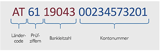 TheIBAN is easy to notice, because it is made up of the 11-digit account number and the 5-digit bank (sort) code, together with the national code AT for Austria and a 2-digit verification number. That means that, other than these four characters, the IBAN is uniquely assigned to you.