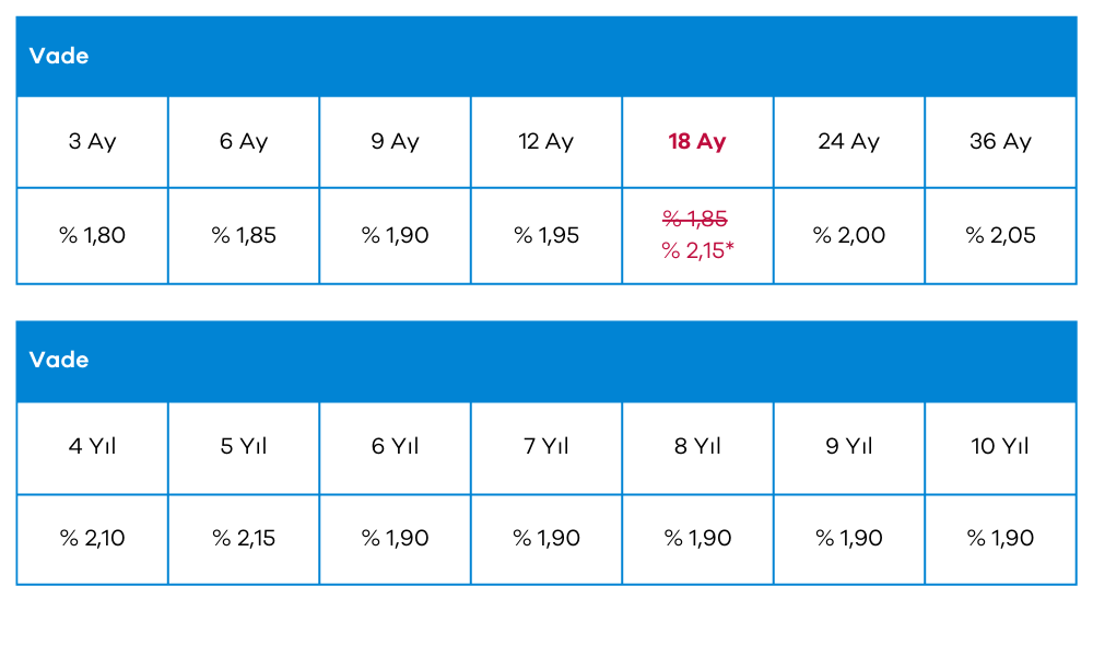 *Özel faiz oranı sadece bireysel müşteriler için geçerlidir. 2.1.2026 - 30.01.2026 tarihleri arasında, yeni açılan vadeli mevduat hesapları ve hesap cüzdanlari için geçerlidir. Bu tarihten sonra, fiyat listemizde belirtilen geçerli faiz oranı uygulanır.